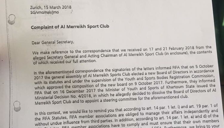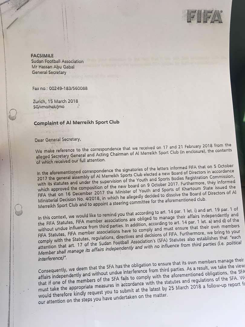 واستفسر الاتحاد الدولي نظيره السوداني عن قرار حل مجلس المريخ المنتخب، وأمهل نظيره الاتحاد السوداني حتى الخامس والعشرين من الشهر الجاري لإطلاعه بالخطوات التي تمت.