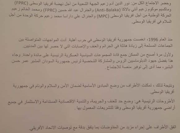 وحضر الاجتماع زعيم الجبهة الشعبية من أجل نهضة إفريقيا الوسطى نور الدين آدم، والقيادي في الجبهة الشعبية الجنرال عبد الله حسين، و زعيم حركة “آنتي بالاكا” مكسيم موكوم وزعيم الحركة الوطنية من أجل إفريقيا الوسطى محمد الخاتم، وزعيم حركة الوحدة من أجل السلام في أفريقيا الوسطى والجنرال علي داراسا محمد.