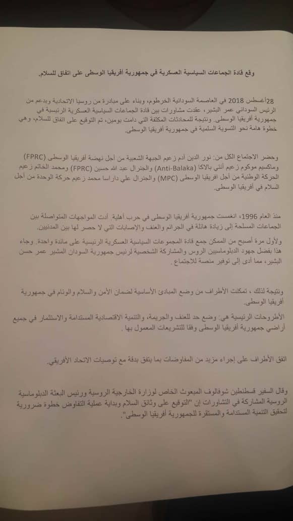 وقال المبعوث الخاص لوزراة الخارجية الروسية المشاركة في المفاوضات السفير قسطنطين شوفالوف وفقاً للبيان الختامي للمفاوضات إن التوقيع على وثائق السلام وبداية عملية التفاوض خطوة ضرورية لتحقيق التنمية المستدامة والمستقرة في جمهورية إفريقيا الوسطى ، ووفقاً للبيان فان المبادرة الروسية والرعاية الشخصية للرئيس عمر البشير أدت لجمع أطراف النزاع بإفريقيا الوسطى للمرة الأولى على مائدة واحدة للتفاوض.