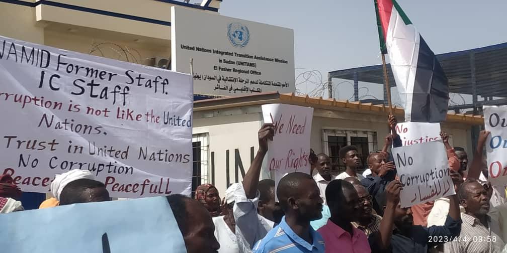نفذ عاملون مؤقتون بالبعثة المشتركة للأمم المتحدة والأتحاد الأفريقي بدارفور (يوناميد) سابقآ بولاية شمال دارفور اليوم أمام مقر المكتب الإقليمي للأمم المتحدة المتكاملة لدعم المرحلة الإنتقالية بالسودان (يونيتامس) بمدينة الفاشر، وبرنامج الأمم المتحدة الإنمائي (UNP) نفذوا وقفة إحتجاجية للمطالبة بحقوقهم التي وصفوها بالمشروعة.