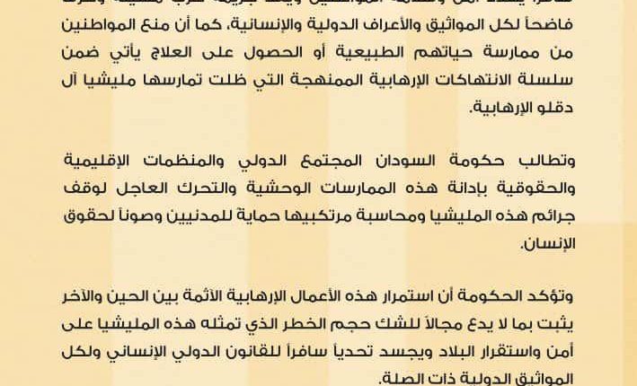 وطالب مجلس السيادة، المجتمع الدولي والمنظمات الإقليمية والحقوقية بإدانة هذه الممارسات الوحشية والتحرّك العاجل لوقف جرائم هذه الميليشيا ومحاسبة مرتكبيها حمايةً للمدنيين وصونًا لحقوق الإنسان.