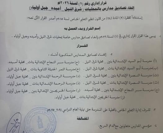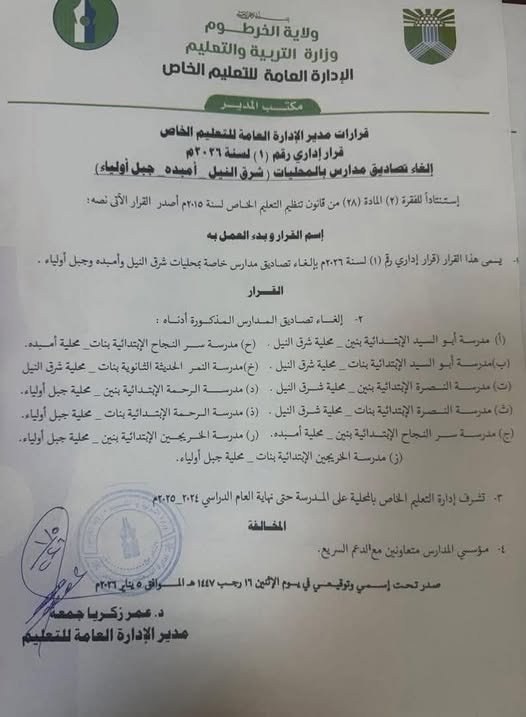 أصدرت وزارة التربية والتعليم في الخرطوم، قرارًا قضى بإلغاء تصاديق 10 مدارس بسبب تعاون مؤسسيها مع ميليشيا الدعم السريع.