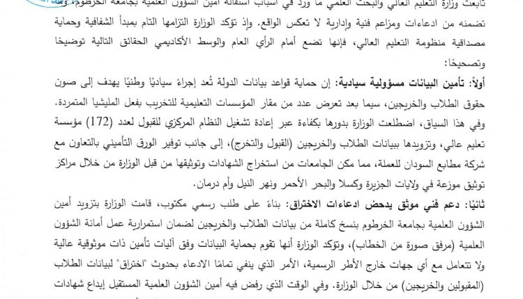 التعليم العالي تحسم جدل”اختراق” بيانات طلاب جامعة الخرطوم