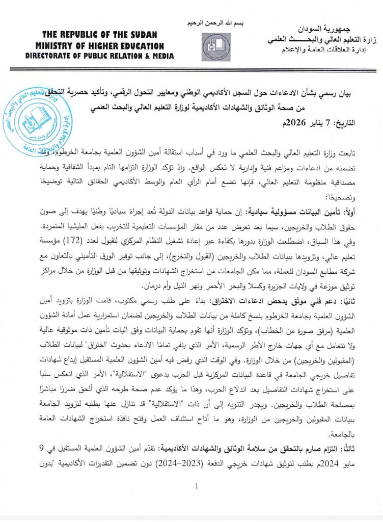 قالت وزارة التعليم العالي والبحث العلمي إنها تابعت ما ورد في أسباب استقالة أمين الشؤون العلمية بجامعة الخرطوم، وما تضمنه من ادعاءات ومزاعم فنية وإدارية لا تعكس الواقع.