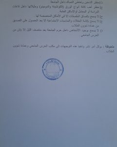 وتضمنت التوجيهات عدم السماح بارتداء الطالبات للبنطال وكشف الرأس داخل الحرم الجامعي وارتداء أغطية الرأس الشفافة التي تظهر الشعر، بجانب توجيه الطلاب بعدم لبس السبح والسلاسل أو الأسورة أو ما في حكمها وحلاقة وتصفيف الشعر بصورة غير لائقة.