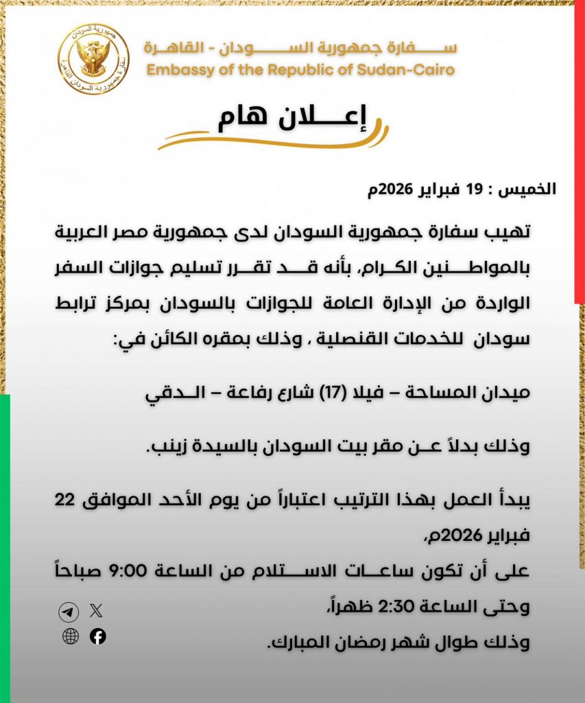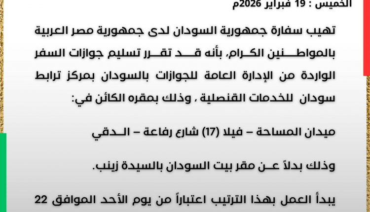 دعت سفارة جمهورية السودان لدى مصر، المواطنين إلى استلام جوازات السفر الواردة من الإدارة العامة للجوازات بالسودان بمركز ترابط سودان للخدمات القنصلية في مقرّه بميدان المساحة فيلا 17 شارع رفاعة الدقي، وذلك بدلاً عن مقرّ بيت السودان بالسيّدة زينب.